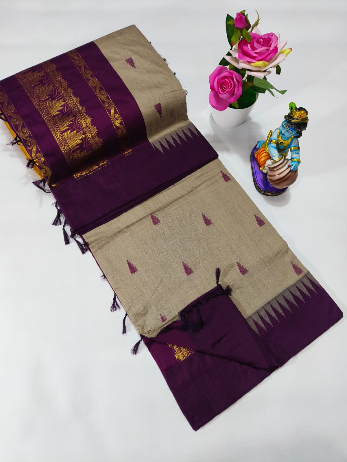 Exquisite Beige and Purple Cotton Silk Saree for Women is a stunning addition to any wardrobe. This elegant piece is crafted from the finest Kalyani cotton silk, boasting a luxurious feel and a beautiful drape.